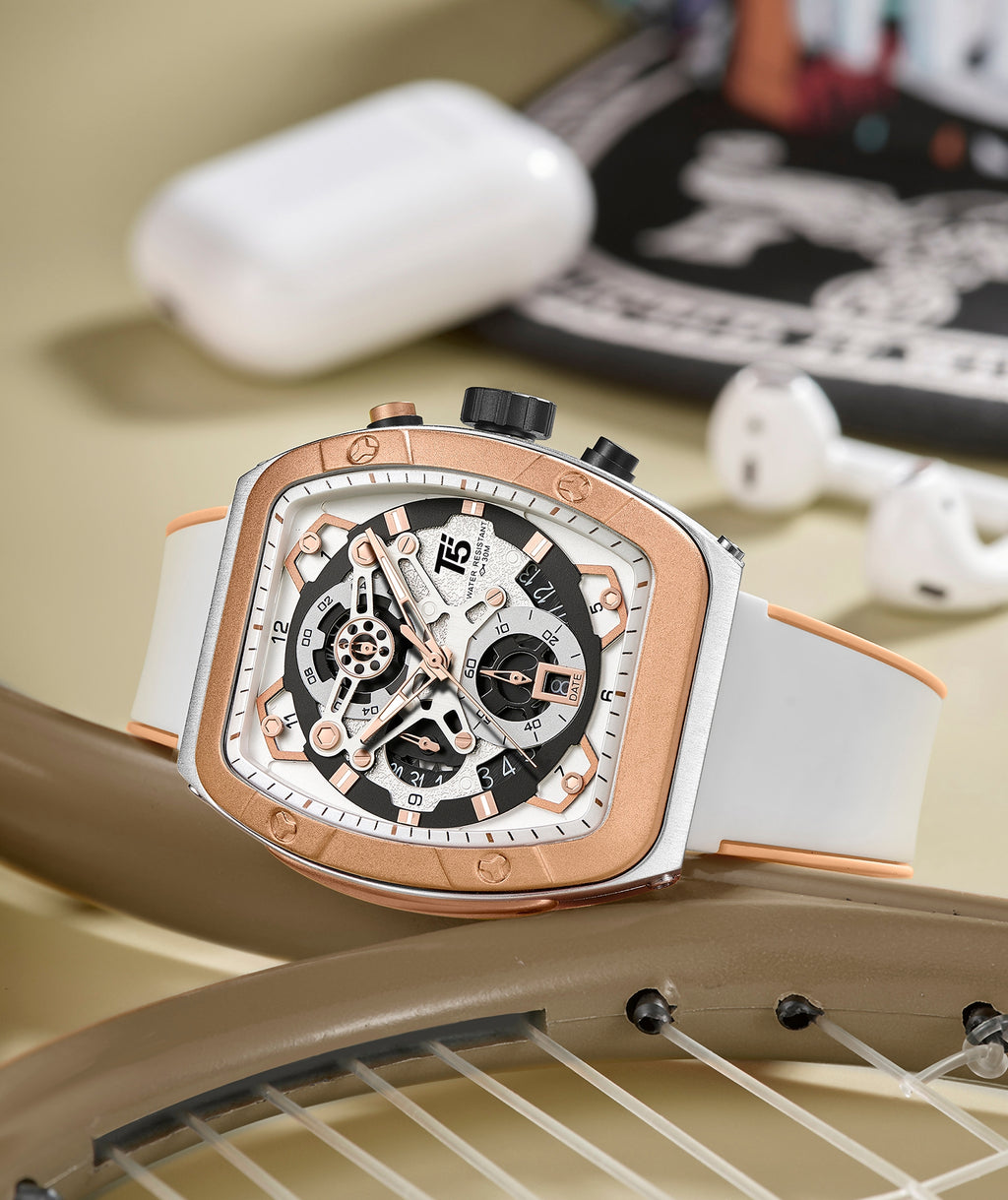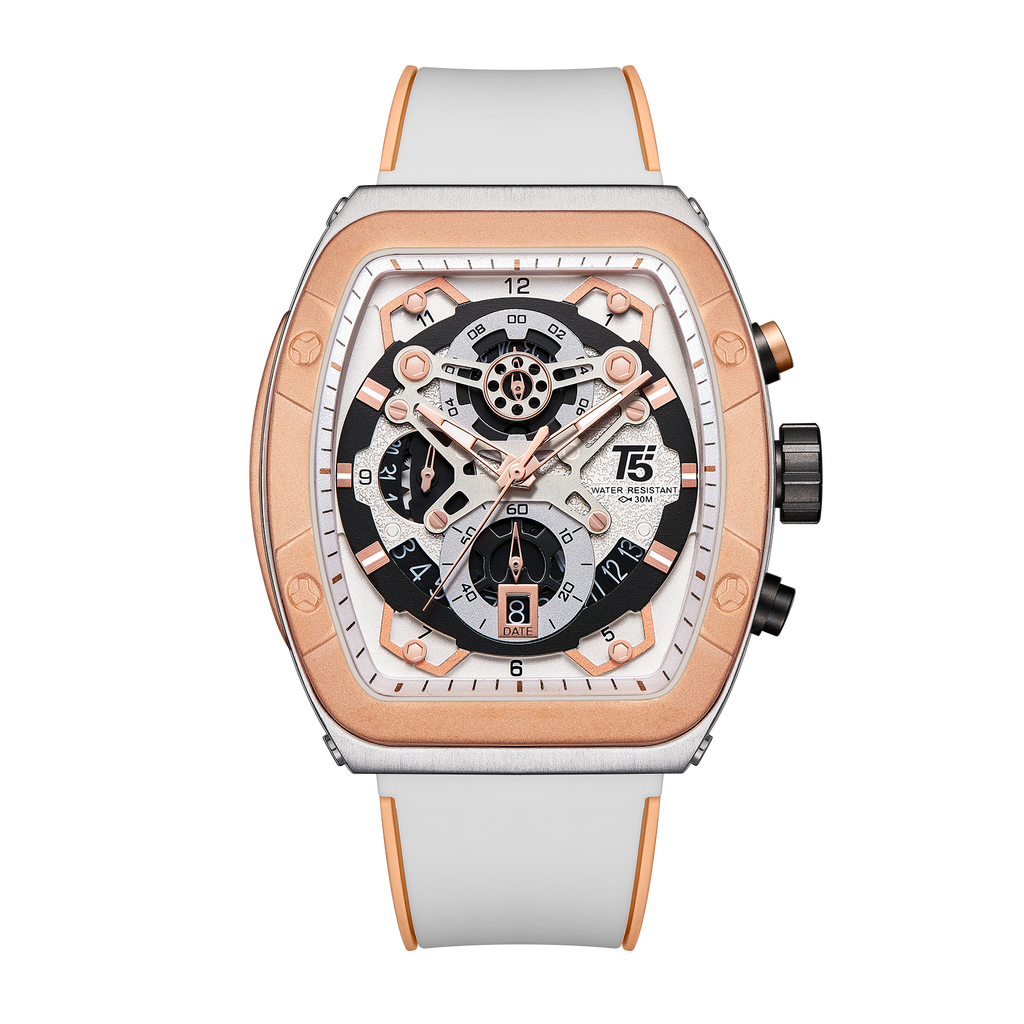 OVERFLY T5 Mens Watch Analog Chronograph Luxury Watch With White & Rose Gold Dial & White Silicone Strap Wrist Watch For Men