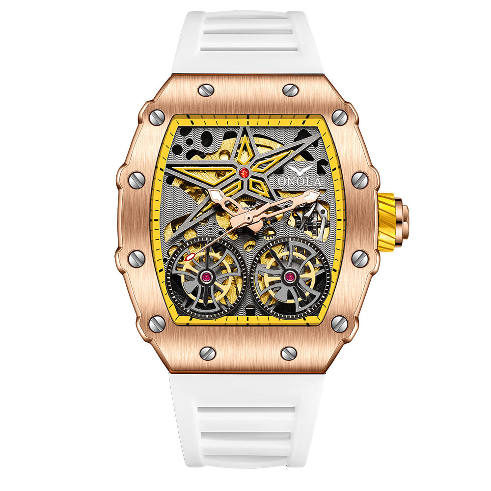 OVERFLY Onola Double Tourbillon Automatic Skeleton Mechanical Flywheel Unique Dial Luxury Men's Watch - 6828-BLK-RED
